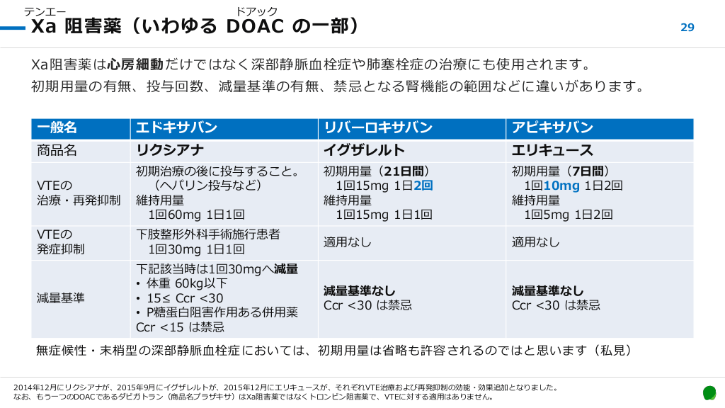 #29. テンエー ドアック Xa 阻害薬(いわゆる DOAC の一部) 29 Xa阻害薬は心房細動だけではなく深部静脈血栓症や肺塞栓症の治療にも使用されます。 初期用量の有無、投与回数、減量基準の有無、禁忌となる腎機能の範囲などに違いがあります。 一般名 エドキサバン リバーロキサバン アピキサバン 商品名 リクシアナ イグザレルト エリキュース VTEの 治療・再発抑制 初期治療の後に投与すること。 (ヘパリン投与など) 維持用量 1回60mg 1日1回 初期用量(21日間) 1回15mg 1日2回 維持用量 1回15mg 1日1回 初期用量(7日間) 1回10mg 1日2回 維持用量 1回5mg 1日2回 VTEの 発症抑制 下肢整形外科手術施行患者 1回30mg 1日1回 適用なし 適用なし 減量基準 下記該当時は1回30mgへ減量 • 体重 60kg以下 • 15≤ Ccr <30 • P糖蛋白阻害作用ある併用薬 Ccr <15 は禁忌 減量基準なし Ccr <30 は禁忌 減量基準なし Ccr <30 は禁忌 無症候性・末梢型の深部静脈血栓症においては、初期用量は省略も許容されるのではと思います(私見) 2014年12月にリクシアナが、2015年9月にイグザレルトが、2015年12月にエリキュースが、それぞれVTE治療および再発抑制の効能・効果追加となりました。 なお、もう一つのDOACであるダビガトラン(商品名プラザキサ)はXa阻害薬ではなくトロンビン阻害薬で、VTEに対する適用はありません。