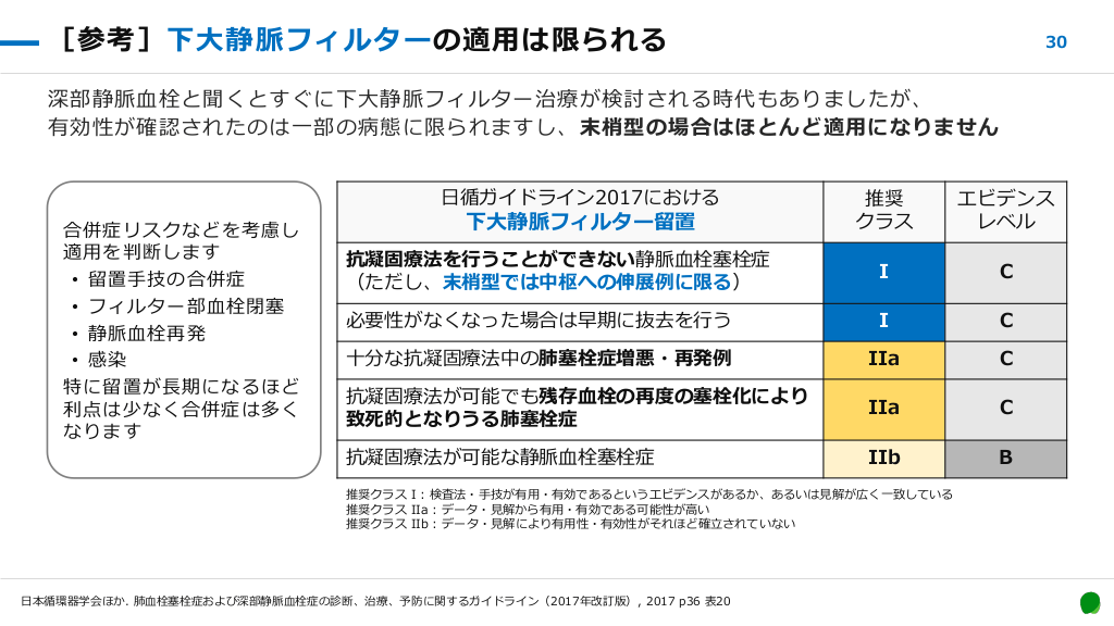 #30. [参考]下大静脈フィルターの適用は限られる 30 深部静脈血栓と聞くとすぐに下大静脈フィルター治療が検討される時代もありましたが、 有効性が確認されたのは一部の病態に限られますし、末梢型の場合はほとんど適用になりません 日循ガイドライン2017における 合併症リスクなどを考慮し 適用を判断します • 留置手技の合併症 • フィルター部血栓閉塞 • 静脈血栓再発 • 感染 特に留置が長期になるほど 利点は少なく合併症は多く なります 推奨 クラス エビデンス レベル 抗凝固療法を行うことができない静脈血栓塞栓症 (ただし、末梢型では中枢への伸展例に限る) I C 必要性がなくなった場合は早期に抜去を行う I C 十分な抗凝固療法中の肺塞栓症増悪・再発例 IIa C 抗凝固療法が可能でも残存血栓の再度の塞栓化により 致死的となりうる肺塞栓症 IIa C 抗凝固療法が可能な静脈血栓塞栓症 IIb B 下大静脈フィルター留置 推奨クラス I : 検査法・手技が有用・有効であるというエビデンスがあるか、あるいは見解が広く一致している 推奨クラス IIa : データ・見解から有用・有効である可能性が高い 推奨クラス IIb : データ・見解により有用性・有効性がそれほど確立されていない 日本循環器学会ほか. 肺血栓塞栓症および深部静脈血栓症の診断、治療、予防に関するガイドライン(2017年改訂版), 2017 p36 表20