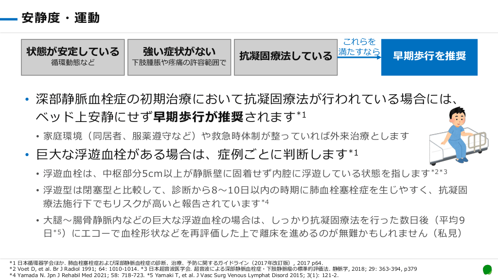 #32. 安静度・運動 状態が安定している 強い症状がない 循環動態など 下肢腫脹や疼痛の許容範囲で 抗凝固療法している これらを 満たすなら 早期歩行を推奨 • 深部静脈血栓症の初期治療において抗凝固療法が行われている場合には、 ベッド上安静にせず早期歩行が推奨されます *1 • 家庭環境(同居者、服薬遵守など)や救急時体制が整っていれば外来治療とします • 巨大な浮遊血栓がある場合は、症例ごとに判断します *1 • 浮遊血栓は、中枢部分5cm以上が静脈壁に固着せず内腔に浮遊している状態を指します *2*3 • 浮遊型は閉塞型と比較して、診断から8~10日以内の時期に肺血栓塞栓症を生じやすく、抗凝固 療法施行下でもリスクが高いと報告されています *4 • 大腿~腸骨静脈内などの巨大な浮遊血栓の場合は、しっかり抗凝固療法を行った数日後(平均9 日 *5 )にエコーで血栓形状などを再評価した上で離床を進めるのが無難かもしれません(私見) *1 日本循環器学会ほか. 肺血栓塞栓症および深部静脈血栓症の診断、治療、予防に関するガイドライン(2017年改訂版), 2017 p64. *2 Voet D, et al. Br J Radiol 1991; 64: 1010-1014. *3 日本超音波医学会. 超音波による深部静脈血栓症・下肢静脈瘤の標準的評価法. 静脈学, 2018; 29: 363-394, p379 *4 Yamada N. Jpn J Rehabil Med 2021; 58: 718-723. *5 Yamaki T, et al. J Vasc Surg Venous Lymphat Disord 2015; 3(1): 121-2.