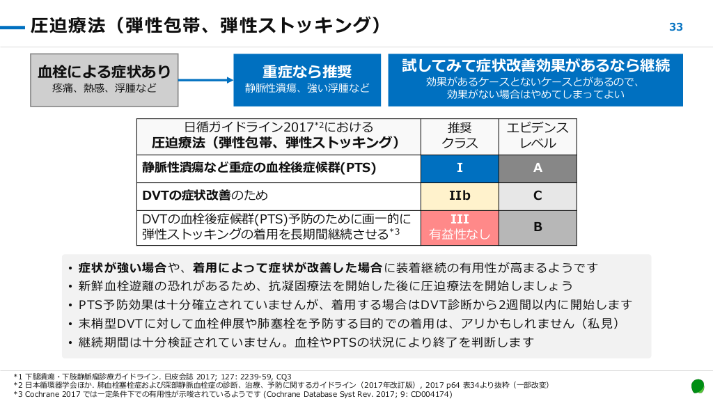 #33. 圧迫療法(弾性包帯、弾性ストッキング) 血栓による症状あり 重症なら推奨 疼痛、熱感、浮腫など 静脈性潰瘍、強い浮腫など 33 試してみて症状改善効果があるなら継続 日循ガイドライン2017*2における 圧迫療法(弾性包帯、弾性ストッキング) 静脈性潰瘍など重症の血栓後症候群(PTS) DVTの症状改善のため DVTの血栓後症候群(PTS)予防のために画一的に 弾性ストッキングの着用を長期間継続させる*3 効果があるケースとないケースとがあるので、 効果がない場合はやめてしまってよい 推奨 クラス エビデンス レベル I A IIb C III 有益性なし B • 症状が強い場合や、着用によって症状が改善した場合に装着継続の有用性が高まるようです • 新鮮血栓遊離の恐れがあるため、抗凝固療法を開始した後に圧迫療法を開始しましょう • PTS予防効果は十分確立されていませんが、着用する場合はDVT診断から2週間以内に開始します • 末梢型DVTに対して血栓伸展や肺塞栓を予防する目的での着用は、アリかもしれません(私見) • 継続期間は十分検証されていません。血栓やPTSの状況により終了を判断します *1 下腿潰瘍・下肢静脈瘤診療ガイドライン. 日皮会誌 2017; 127: 2239-59, CQ3 *2 日本循環器学会ほか. 肺血栓塞栓症および深部静脈血栓症の診断、治療、予防に関するガイドライン(2017年改訂版), 2017 p64 表34より抜粋(一部改変) *3 Cochrane 2017 では一定条件下での有用性が示唆されているようです (Cochrane Database Syst Rev. 2017; 9: CD004174)