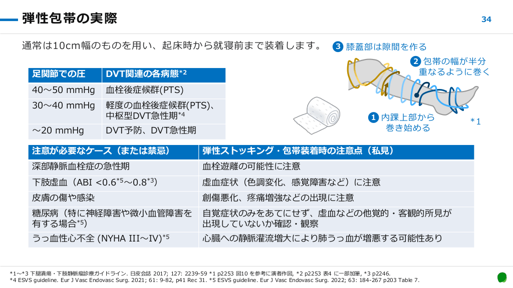 #34. 弾性包帯の実際 34 通常は10cm幅のものを用い、起床時から就寝前まで装着します。 3 膝蓋部は隙間を作る 2 包帯の幅が半分 重なるように巻く 足関節での圧 DVT関連の各病態*2 40~50 mmHg 血栓後症候群(PTS) 30~40 mmHg 軽度の血栓後症候群(PTS)、 中枢型DVT急性期*4 ~20 mmHg 1 内踝上部から 巻き始める DVT予防、DVT急性期 注意が必要なケース(または禁忌) 弾性ストッキング・包帯装着時の注意点(私見) 深部静脈血栓症の急性期 血栓遊離の可能性に注意 下肢虚血(ABI <0.6*5~0.8*3) 虚血症状(色調変化、感覚障害など)に注意 皮膚の傷や感染 創傷悪化、疼痛増強などの出現に注意 糖尿病(特に神経障害や微小血管障害を 有する場合*5) 自覚症状のみをあてにせず、虚血などの他覚的・客観的所見が 出現していないか確認・観察 うっ血性心不全 (NYHA III~IV)*5 心臓への静脈灌流増大により肺うっ血が増悪する可能性あり *1~*3 下腿潰瘍・下肢静脈瘤診療ガイドライン. 日皮会誌 2017; 127: 2239-59 *1 p2253 図10 を参考に演者作図, *2 p2253 表4 に一部加筆, *3 p2246. *4 ESVS guideline. Eur J Vasc Endovasc Surg. 2021; 61: 9-82, p41 Rec 31. *5 ESVS guideline. Eur J Vasc Endovasc Surg. 2022; 63: 184-267 p203 Table 7. *1