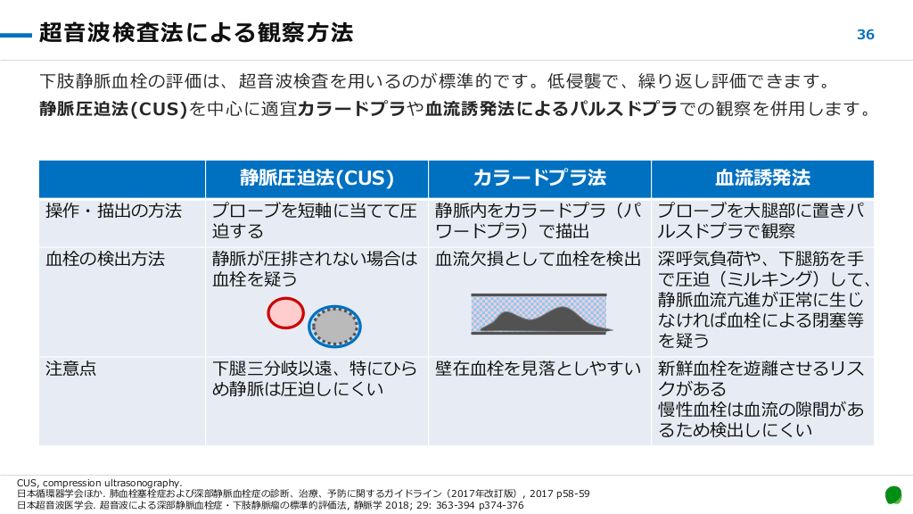 #36. 超音波検査法による観察方法 36 下肢静脈血栓の評価は、超音波検査を用いるのが標準的です。低侵襲で、繰り返し評価できます。 静脈圧迫法(CUS)を中心に適宜カラードプラや血流誘発法によるパルスドプラでの観察を併用します。 静脈圧迫法(CUS) カラードプラ法 血流誘発法 操作・描出の方法 プローブを短軸に当てて圧 迫する 静脈内をカラードプラ(パ ワードプラ)で描出 プローブを大腿部に置きパ ルスドプラで観察 血栓の検出方法 静脈が圧排されない場合は 血栓を疑う 血流欠損として血栓を検出 深呼気負荷や、下腿筋を手 で圧迫(ミルキング)して、 静脈血流亢進が正常に生じ なければ血栓による閉塞等 を疑う 注意点 下腿三分岐以遠、特にひら め静脈は圧迫しにくい 壁在血栓を見落としやすい 新鮮血栓を遊離させるリス クがある 慢性血栓は血流の隙間があ るため検出しにくい CUS, compression ultrasonography. 日本循環器学会ほか. 肺血栓塞栓症および深部静脈血栓症の診断、治療、予防に関するガイドライン(2017年改訂版), 2017 p58-59 日本超音波医学会. 超音波による深部静脈血栓症・下肢静脈瘤の標準的評価法, 静脈学 2018; 29: 363-394 p374-376