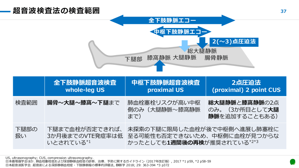 #37. 超音波検査法の検査範囲 37 全下肢静脈エコー 中枢下肢静脈エコー 2(~3)点圧迫法 総大腿静脈 腸骨静脈 下腿部 膝窩静脈 大腿静脈 全下肢静脈超音波検査 中枢下肢静脈超音波検査 2点圧迫法 whole-leg US proximal US (proximal) 2 point CUS 検査範囲 腸骨~大腿~膝窩~下腿まで 肺血栓塞栓リスクが高い中枢 側のみ(大腿静脈~膝窩静脈 まで) 総大腿静脈と膝窩静脈の2点 のみ。(3か所目として大腿 静脈を追加することもある) 下腿部の 扱い 下腿まで血栓が否定できれば、 未探索の下腿に限局した血栓が後で中枢側へ進展し肺塞栓に 3か月後までのVTE発症率は低 至る可能性も否定できないため、中枢側に血栓が見つからな いとされている*1 かったとしても1週間後の再検が推奨されている*2*3 US, ultrasonography; CUS, compression ultrasonography. 日本循環器学会ほか. 肺血栓塞栓症および深部静脈血栓症の診断、治療、予防に関するガイドライン(2017年改訂版), 2017 *1 p59, *2 p58-59 日本超音波医学会. 超音波による深部静脈血栓症・下肢静脈瘤の標準的評価法, 静脈学 2018; 29: 363-394 *3 p372