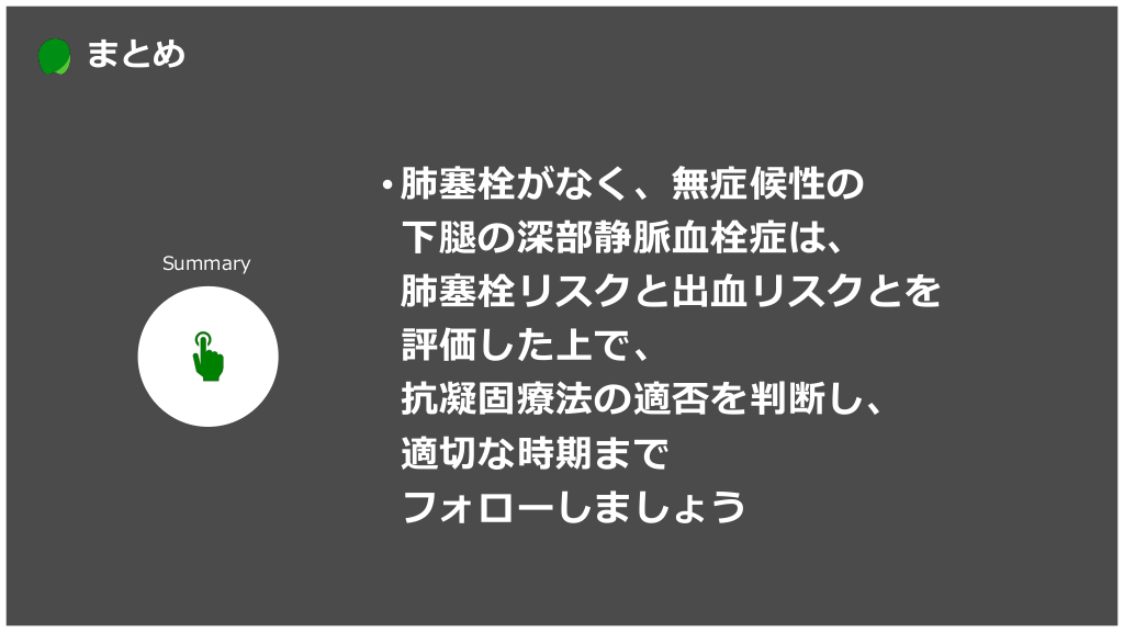 #3. まとめ Summary • 肺塞栓がなく、無症候性の 下腿の深部静脈血栓症は、 肺塞栓リスクと出血リスクとを 評価した上で、 抗凝固療法の適否を判断し、 適切な時期まで フォローしましょう