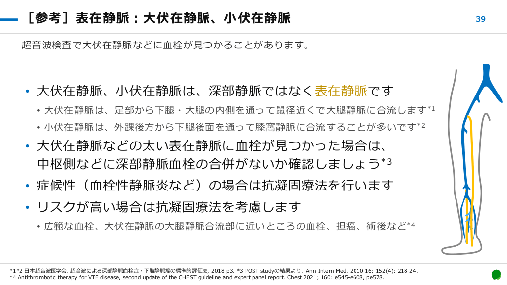 #39. [参考]表在静脈:大伏在静脈、小伏在静脈 超音波検査で大伏在静脈などに血栓が見つかることがあります。 • 大伏在静脈、小伏在静脈は、深部静脈ではなく表在静脈です • 大伏在静脈は、足部から下腿・大腿の内側を通って鼠径近くで大腿静脈に合流します *1 • 小伏在静脈は、外踝後方から下腿後面を通って膝窩静脈に合流することが多いです *2 • 大伏在静脈などの太い表在静脈に血栓が見つかった場合は、 中枢側などに深部静脈血栓の合併がないか確認しましょう *3 • 症候性(血栓性静脈炎など)の場合は抗凝固療法を行います • リスクが高い場合は抗凝固療法を考慮します • 広範な血栓、大伏在静脈の大腿静脈合流部に近いところの血栓、担癌、術後など *4 *1*2 日本超音波医学会. 超音波による深部静脈血栓症・下肢静脈瘤の標準的評価法, 2018 p3. *3 POST studyの結果より.Ann Intern Med. 2010 16; 152(4): 218-24. *4 Antithrombotic therapy for VTE disease, second update of the CHEST guideline and expert panel report. Chest 2021; 160: e545-e608, pe578. 39