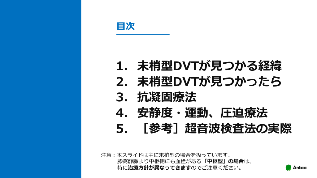 #4. 目次 1. 2. 3. 4. 5. 末梢型DVTが見つかる経緯 末梢型DVTが見つかったら 抗凝固療法 安静度・運動、圧迫療法 [参考]超音波検査法の実際 注意:本スライドは主に末梢型の場合を扱っています。 膝窩静脈より中枢側にも血栓がある「中枢型」の場合は、 特に治療方針が異なってきますのでご注意ください。