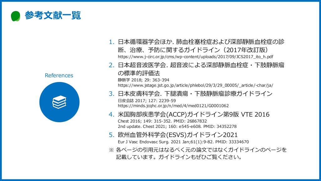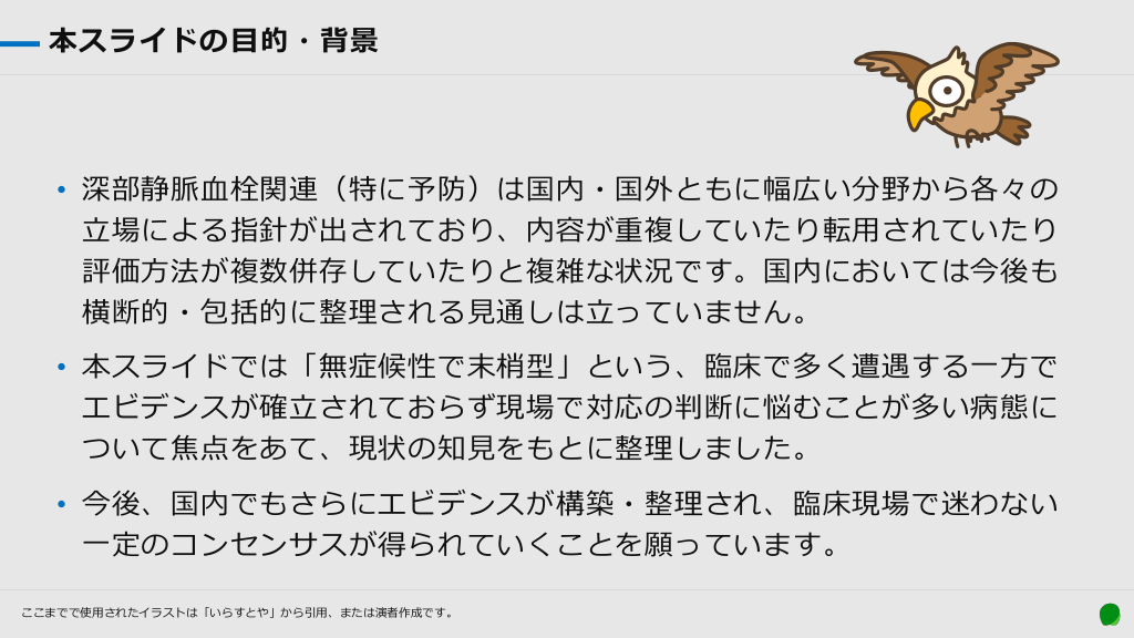 #40. 本スライドの目的・背景 • 深部静脈血栓関連(特に予防)は国内・国外ともに幅広い分野から各々の 立場による指針が出されており、内容が重複していたり転用されていたり 評価方法が複数併存していたりと複雑な状況です。国内においては今後も 横断的・包括的に整理される見通しは立っていません。 • 本スライドでは「無症候性で末梢型」という、臨床で多く遭遇する一方で エビデンスが確立されておらず現場で対応の判断に悩むことが多い病態に ついて焦点をあて、現状の知見をもとに整理しました。 • 今後、国内でもさらにエビデンスが構築・整理され、臨床現場で迷わない 一定のコンセンサスが得られていくことを願っています。 ここまでで使用されたイラストは「いらすとや」から引用、または演者作成です。