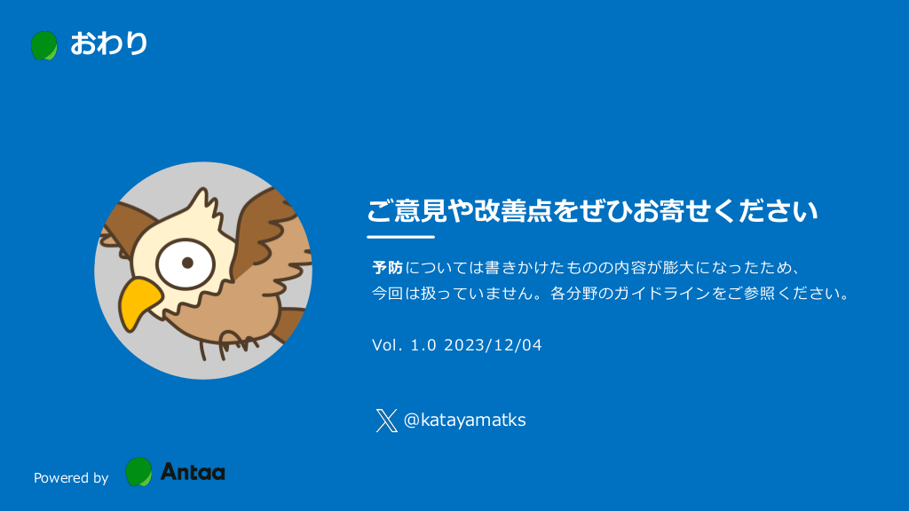 #42. おわり ご意見や改善点をぜひお寄せください • 予防については書きかけたものの内容が膨大になったため、 • 今回は扱っていません。各分野のガイドラインをご参照ください。 • Vol. 1.0 2023/12/04 @katayamatks Powered by
