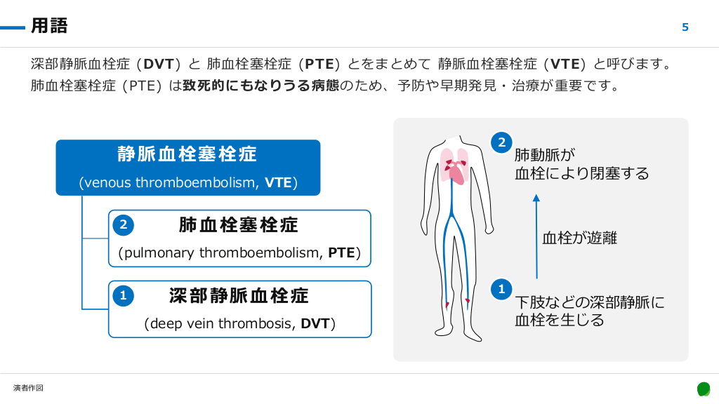 #5. 用語 5 深部静脈血栓症 (DVT) と 肺血栓塞栓症 (PTE) とをまとめて 静脈血栓塞栓症 (VTE) と呼びます。 肺血栓塞栓症 (PTE) は致死的にもなりうる病態のため、予防や早期発見・治療が重要です。 静脈血栓塞栓症 2 (venous thromboembolism, VTE) 2 肺血栓塞栓症 血栓が遊離 (pulmonary thromboembolism, PTE) 1 深部静脈血栓症 (deep vein thrombosis, DVT) 演者作図 肺動脈が 血栓により閉塞する 1 下肢などの深部静脈に 血栓を生じる