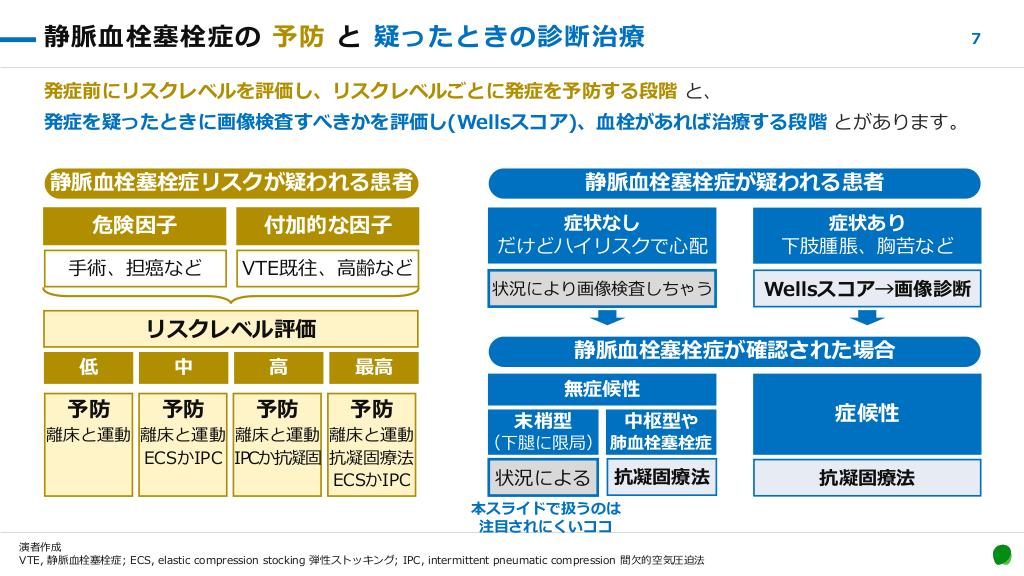 #7. 静脈血栓塞栓症の 予防 と 疑ったときの診断治療 7 発症前にリスクレベルを評価し、リスクレベルごとに発症を予防する段階 と、 発症を疑ったときに画像検査すべきかを評価し(Wellsスコア)、血栓があれば治療する段階 とがあります。 静脈血栓塞栓症リスクが疑われる患者 危険因子 付加的な因子 手術、担癌など VTE既往、高齢など 静脈血栓塞栓症が疑われる患者 症状なし だけどハイリスクで心配 症状あり 下肢腫脹、胸苦など 状況により画像検査しちゃう Wellsスコア→画像診断 リスクレベル評価 低 中 高 最高 予防 予防 予防 予防 離床と運動 離床と運動 離床と運動 離床と運動 ECSかIPC IPCか抗凝固 抗凝固療法 ECSかIPC 静脈血栓塞栓症が確認された場合 無症候性 末梢型 中枢型や 症候性 (下腿に限局) 肺血栓塞栓症 状況による 抗凝固療法 本スライドで扱うのは 注目されにくいココ 演者作成 VTE, 静脈血栓塞栓症; ECS, elastic compression stocking 弾性ストッキング; IPC, intermittent pneumatic compression 間欠的空気圧迫法 抗凝固療法