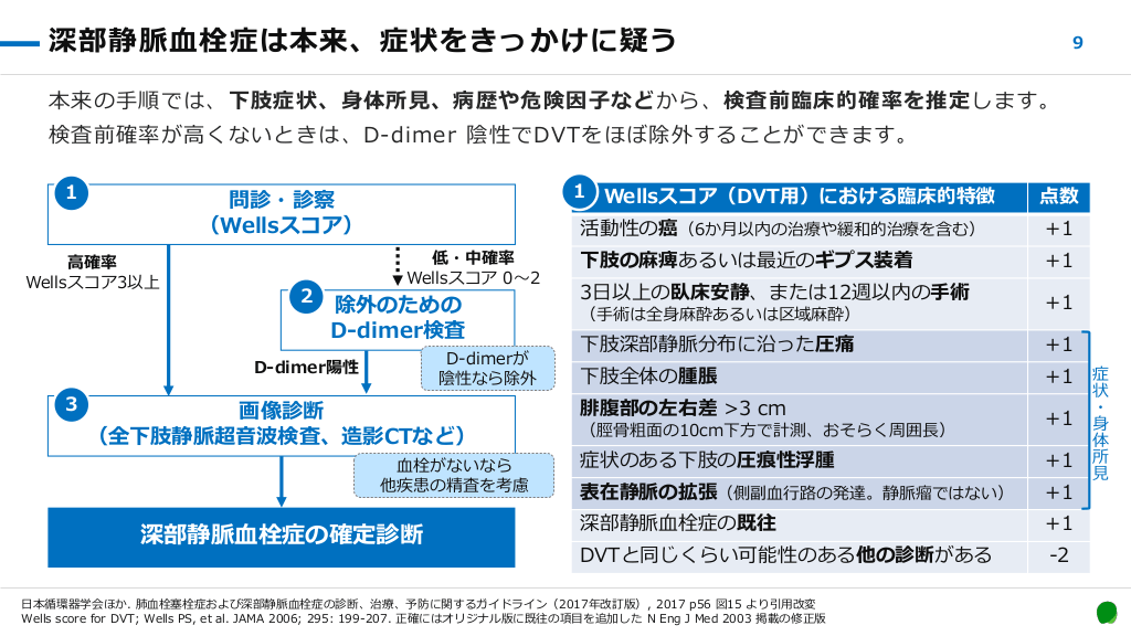 #9. 深部静脈血栓症は本来、症状をきっかけに疑う 9 本来の手順では、下肢症状、身体所見、病歴や危険因子などから、検査前臨床的確率を推定します。 検査前確率が高くないときは、D-dimer 陰性でDVTをほぼ除外することができます。 1 問診・診察 (Wellsスコア) 高確率 Wellsスコア3以上 2 低・中確率 Wellsスコア 0~2 除外のための D-dimer検査 D-dimerが 陰性なら除外 D-dimer陽性 3 画像診断 (全下肢静脈超音波検査、造影CTなど) 血栓がないなら 他疾患の精査を考慮 深部静脈血栓症の確定診断 1 Wellsスコア(DVT用)における臨床的特徴 点数 活動性の癌(6か月以内の治療や緩和的治療を含む) +1 下肢の麻痺あるいは最近のギプス装着 +1 3日以上の臥床安静、または12週以内の手術 (手術は全身麻酔あるいは区域麻酔) +1 下肢深部静脈分布に沿った圧痛 +1 下肢全体の腫脹 +1 症 腓腹部の左右差 >3 cm (脛骨粗面の10cm下方で計測、おそらく周囲長) +1 症状のある下肢の圧痕性浮腫 +1 表在静脈の拡張(側副血行路の発達。静脈瘤ではない) +1 深部静脈血栓症の既往 +1 DVTと同じくらい可能性のある他の診断がある -2 日本循環器学会ほか. 肺血栓塞栓症および深部静脈血栓症の診断、治療、予防に関するガイドライン(2017年改訂版), 2017 p56 図15 より引用改変 Wells score for DVT; Wells PS, et al. JAMA 2006; 295: 199-207. 正確にはオリジナル版に既往の項目を追加した N Eng J Med 2003 掲載の修正版 状 ・ 身 体 所 見