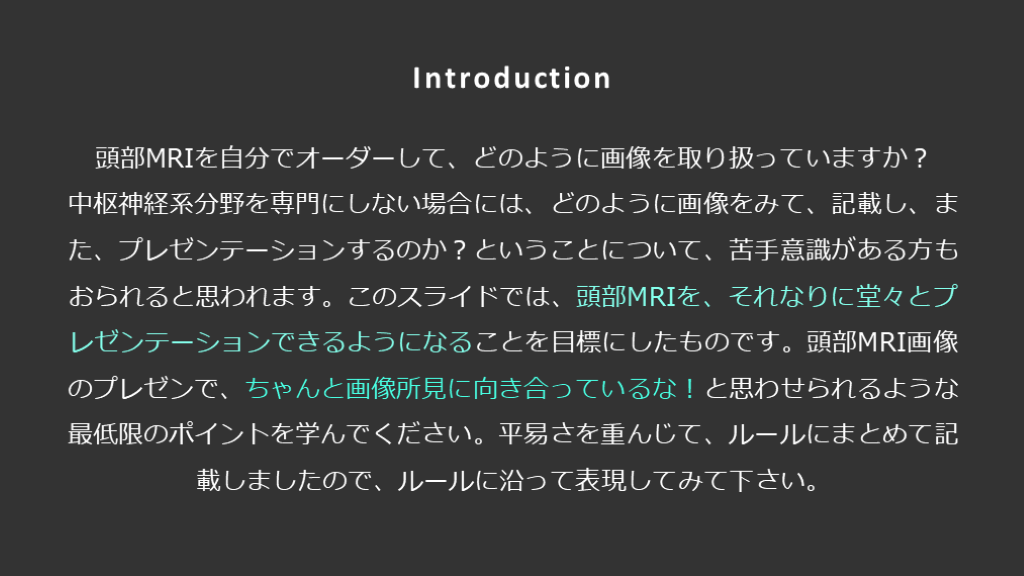 中枢神経系分野を専門にしない場合には、どのように画像をみて、記載し、また、プレゼンテーションするのか?ということについて、苦手意識がある方もおられると思われます。このスライドでは、頭部MRIを、それなりに堂々とプレゼンテーションできるようになることを目標にしたものです。頭部MRI画像のプレゼンで、ちゃんと画像所見に向き合っているな!と思わせられるような最低限のポイントを学んでください。平易さを重んじて、ルールにまとめて記載しましたので、ルールに沿って表現してみて下さい。