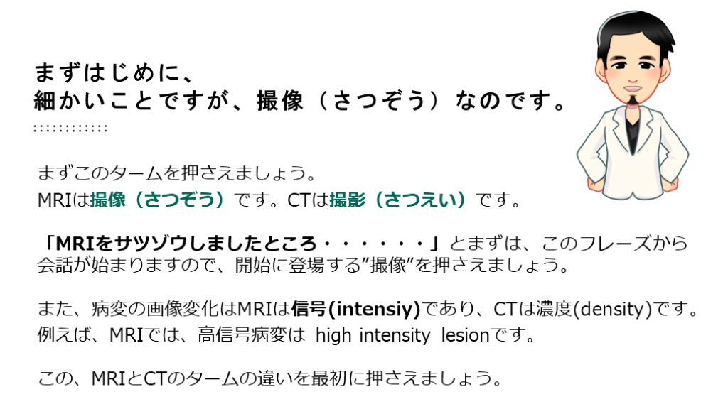 「MRIをサツゾウしましたところ・・・・・・」とまずは、このフレーズから会話が始まりますので、開始に登場する”撮像”を押さえましょう。