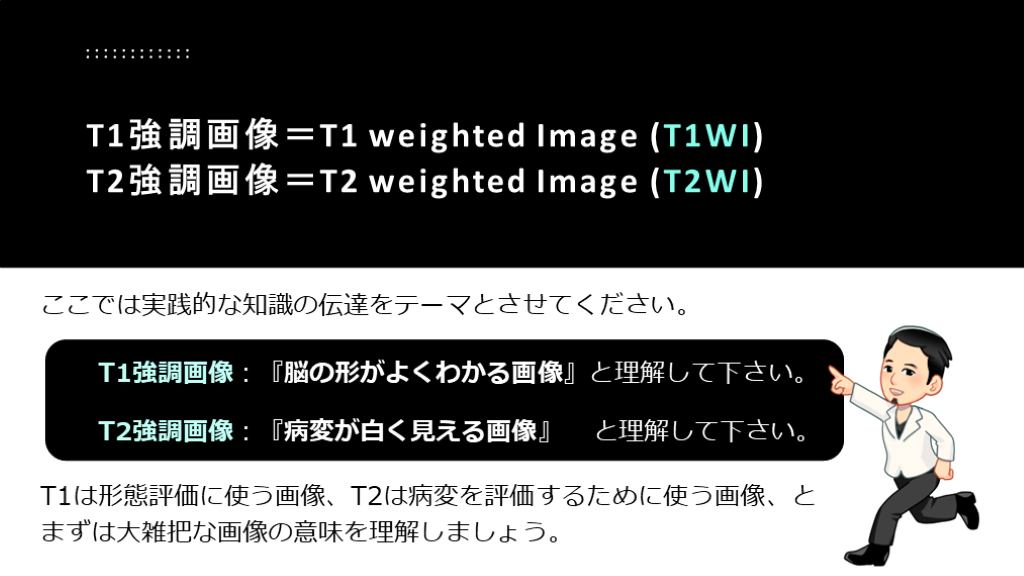 T1は形態評価に使う画像、T2は病変を評価するために使う画像、と