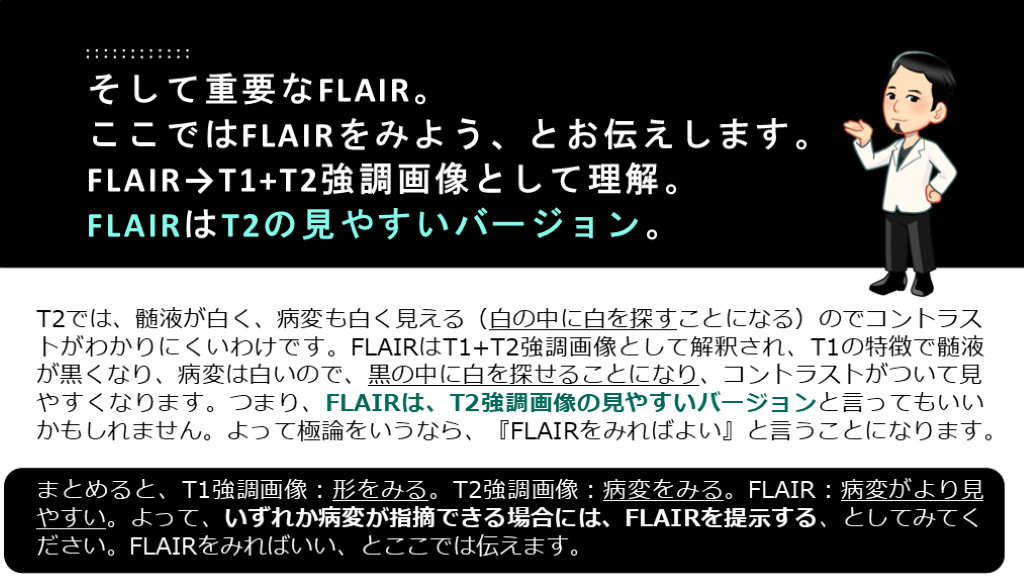 まとめると、T1強調画像:形をみる。T2強調画像:病変をみる。FLAIR:病変がより見やすい。よって、いずれか病変が指摘できる場合には、FLAIRを提示する、としてみてください。FLAIRをみればいい、とここでは伝えます。 そして重要なFLAIR。