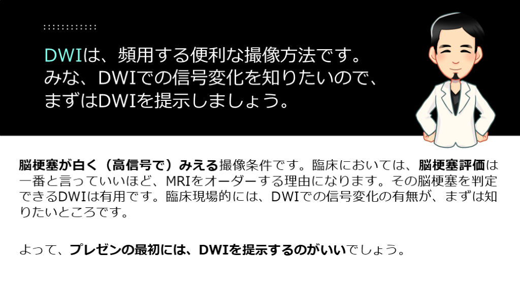 よって、プレゼンの最初には、DWIを提示するのがいいでしょう。 DWIは、頻用する便利な撮像方法です。