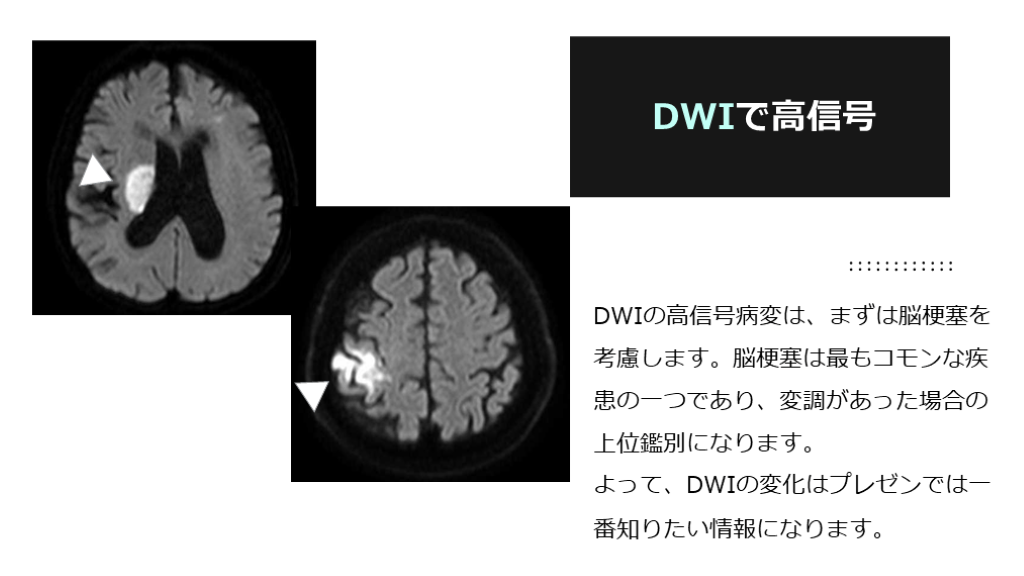 よって、DWIの変化はプレゼンでは一番知りたい情報になります。 DWIで高信号