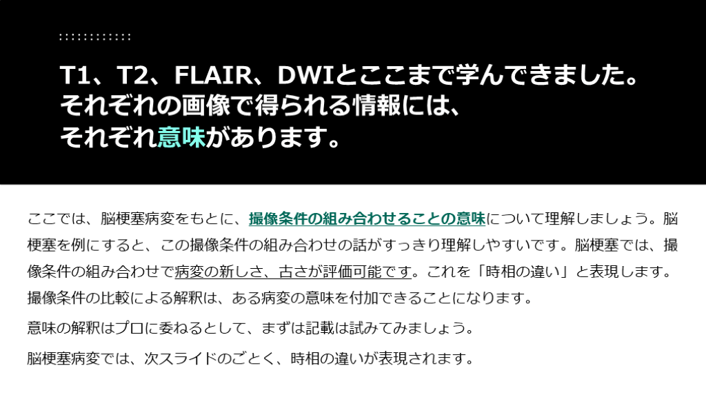 #13. ここでは、脳梗塞病変をもとに、撮像条件の組み合わせることの意味について理解しましょう。脳梗塞を例にすると、この撮像条件の組み合わせの話がすっきり理解しやすいです。脳梗塞では、撮像条件の組み合わせで病変の新しさ、古さが評価可能です。これを「時相の違い」と表現します。撮像条件の比較による解釈は、ある病変の意味を付加できることになります。