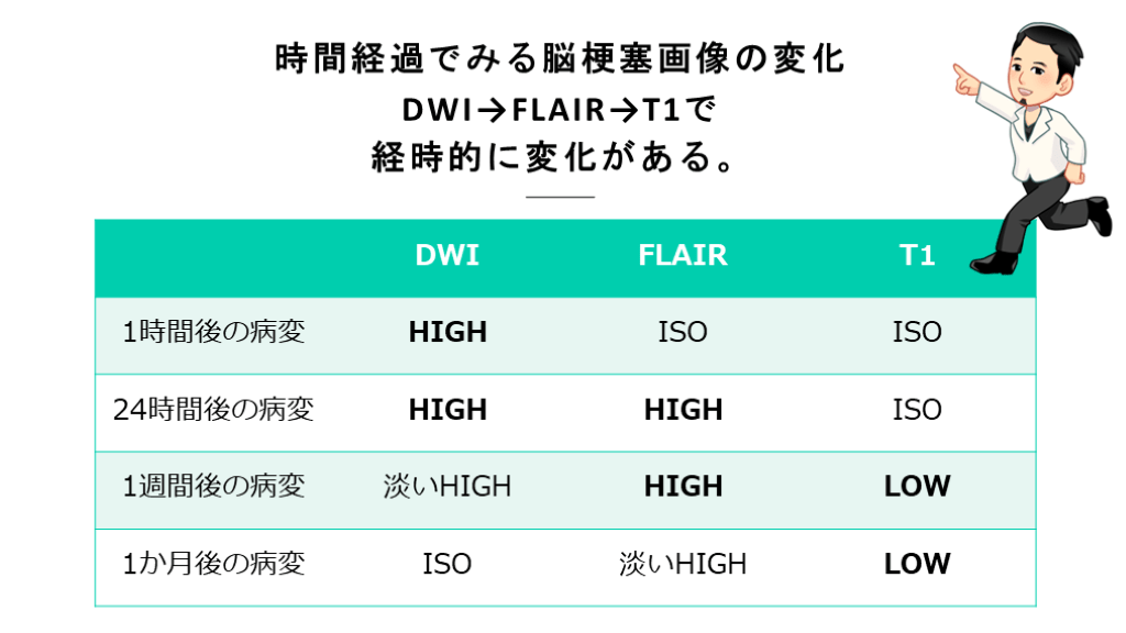 脳梗塞病変では、次スライドのごとく、時相の違いが表現されます。 T1、T2、FLAIR、DWIとここまで学んできました。