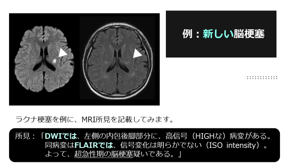 よって、超急性期の脳梗塞疑いである。」 例:新しい脳梗塞