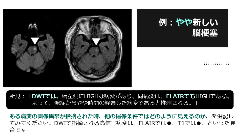 ある病変の画像異常が指摘された時、他の撮像条件ではどのように見えるのか、を併記してみてください。DWIで指摘される高信号病変は、FLAIRでは●、T1では●、といった具合です。 例:やや新しい