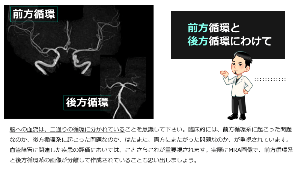 #20. 脳への血流は、二通りの循環に分かれていることを意識して下さい。臨床的には、前方循環系に起こった問題なのか、後方循環系に起こった問題なのか、はたまた、両方にまたがった問題なのか、が重視されています。血管障害に関連した疾患の評価においては、ことさらこれが重要視されます。実際にMRA画像で、前方循環系と後方循環系の画像が分離して作成されていることも思い出しましょう。 前方循環と