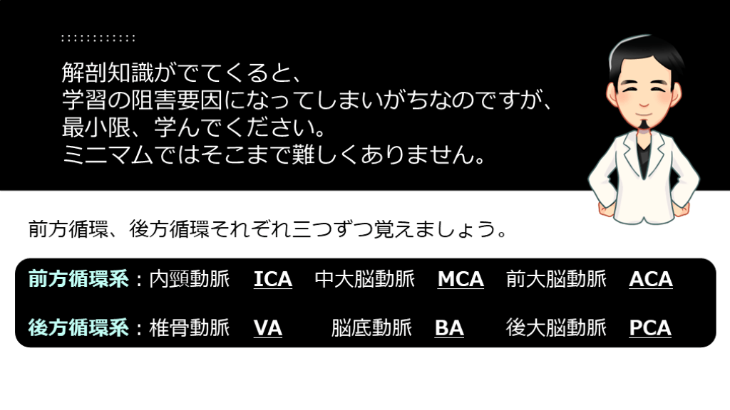後方循環系:椎骨動脈 VA 脳底動脈 BA 後大脳動脈 PCA 解剖知識がでてくると、