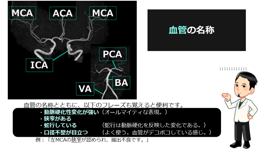 例:「左MCAの狭窄が認められ、描出不良です。」 血管の名称 MCA ACA MCA ICA VA BA PCA