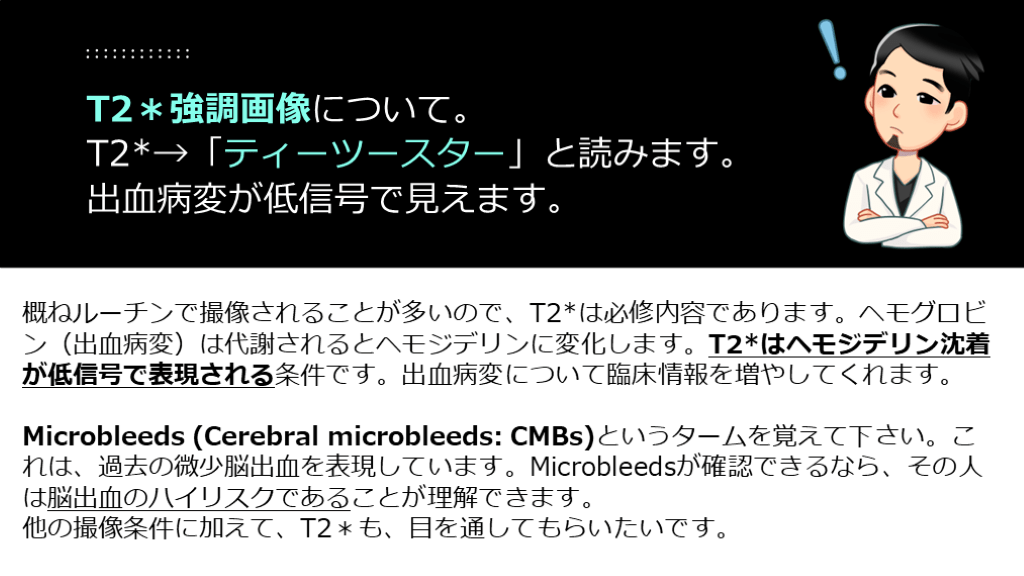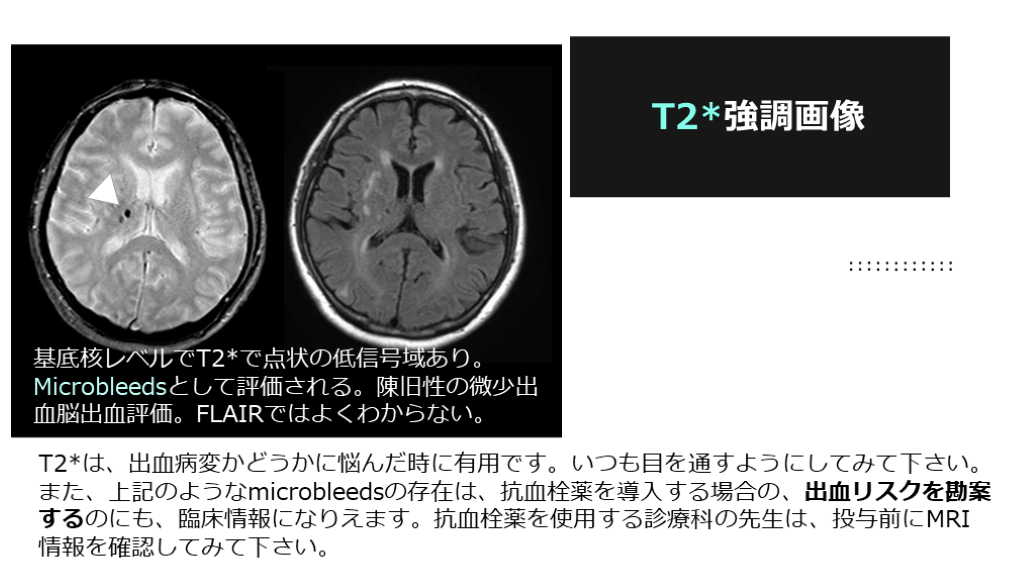他の撮像条件に加えて、T2*も、目を通してもらいたいです。 T2*強調画像について。