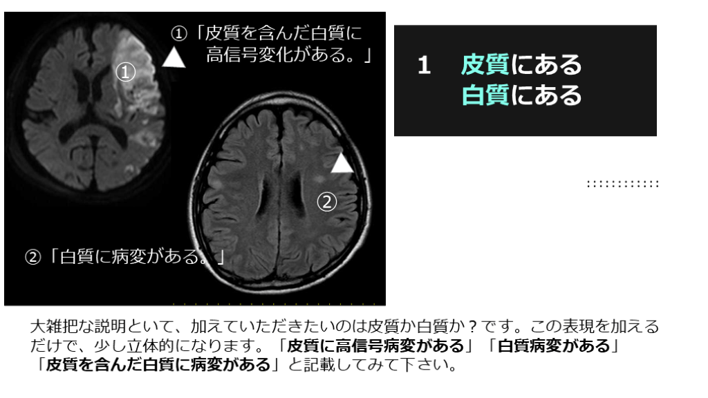 #31. 大雑把な説明といて、加えていただきたいのは皮質か白質か?です。この表現を加えるだけで、少し立体的になります。「皮質に高信号病変がある」「白質病変がある」 「皮質を含んだ白質に病変がある」と記載してみて下さい。 1 皮質にある