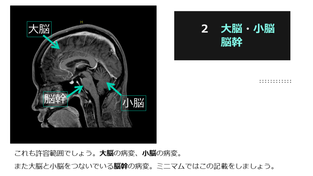 また大脳と小脳をつないでいる脳幹の病変。ミニマムではこの記載をしましょう。 2 大脳・小脳