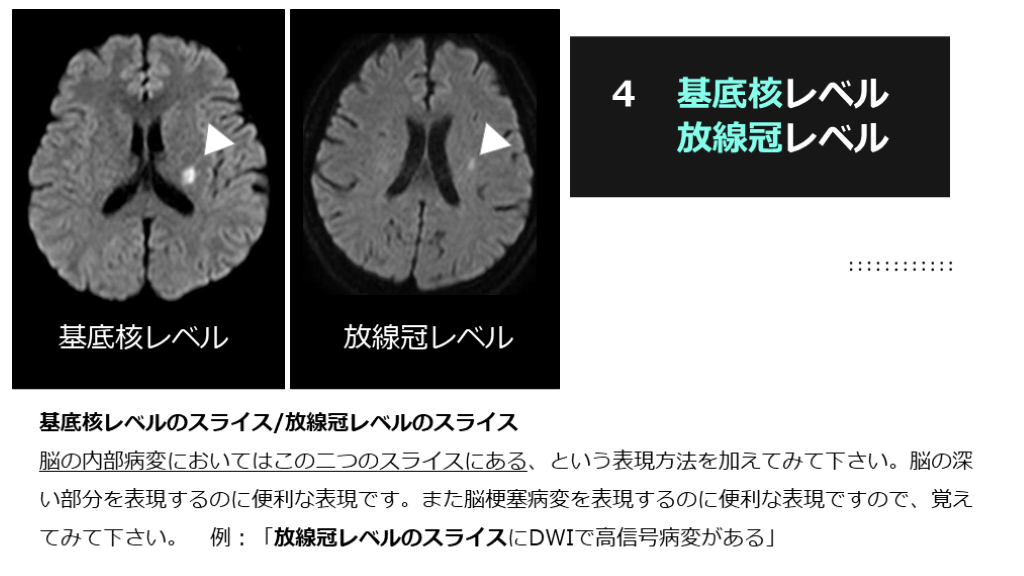 脳の内部病変においてはこの二つのスライスにある、という表現方法を加えてみて下さい。脳の深い部分を表現するのに便利な表現です。また脳梗塞病変を表現するのに便利な表現ですので、覚えてみて下さい。 例:「放線冠レベルのスライスにDWIで高信号病変がある」 4 基底核レベル