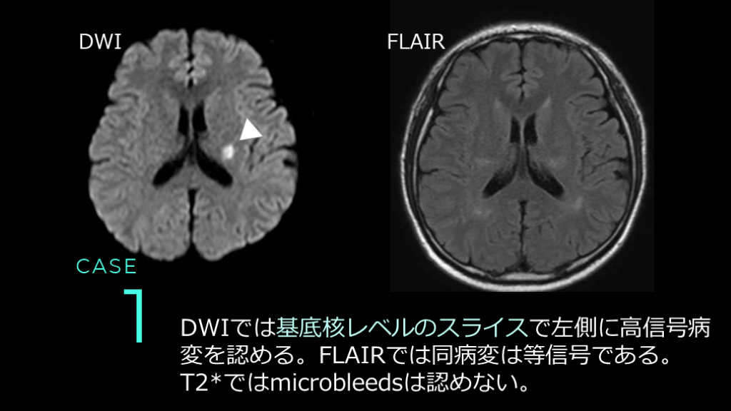 #39. 1 CASE DWIでは基底核レベルのスライスで左側に高信号病変を認める。FLAIRでは同病変は等信号である。