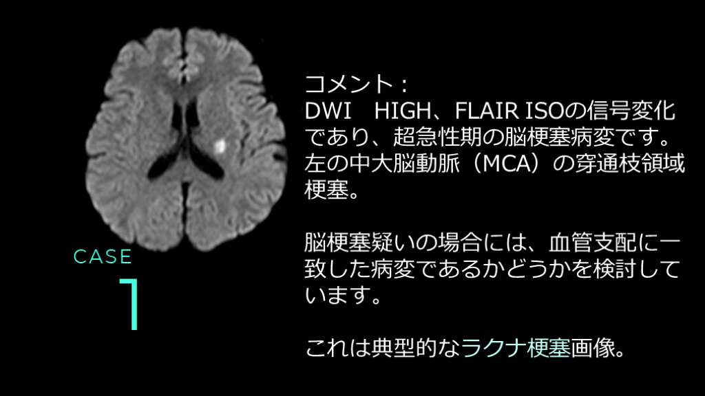 所見:「DWIでは、左側の内包後脚部分に、高信号(HIGHな)病変がある。