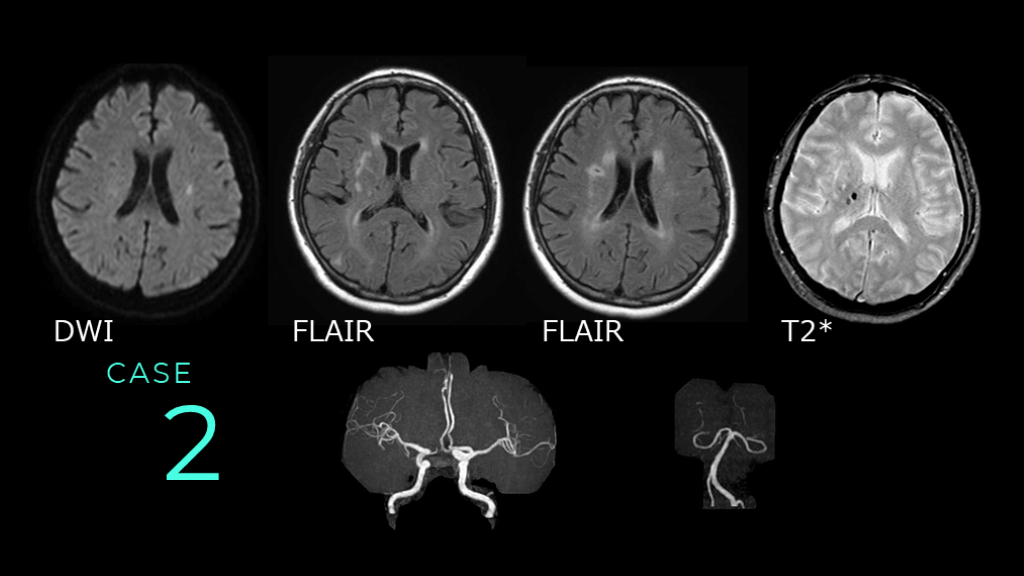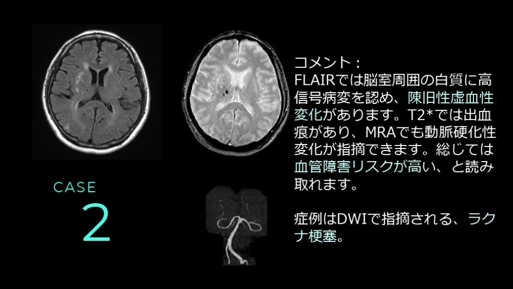 FLAIRでは脳室周囲の白質に高信号病変を認め、陳旧性虚血性変化があります。T2*では出血痕があり、MRAでも動脈硬化性変化が指摘できます。総じては血管障害リスクが高い、と読み取れます。
