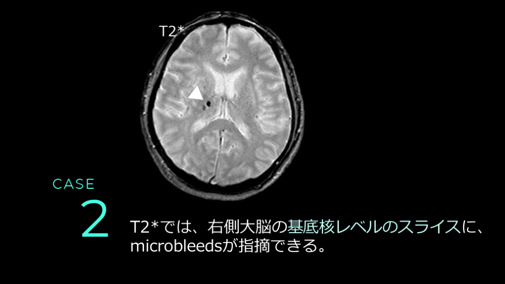 #45. 2 CASE T2*では、右側大脳の基底核レベルのスライスに、microbleedsが指摘できる。 T2*