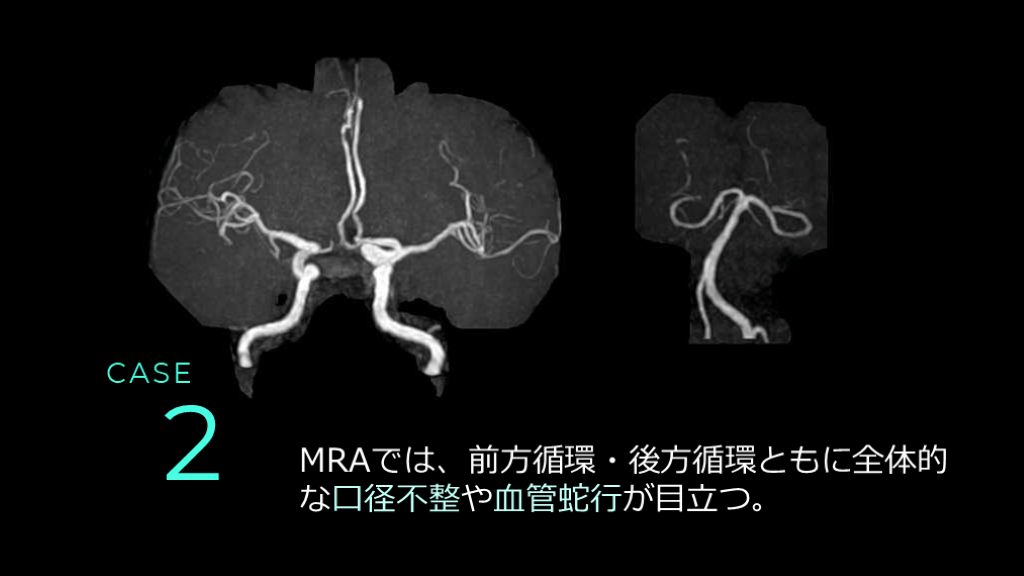#46. CASE 2 MRAでは、前方循環・後方循環ともに全体的な口径不整や血管蛇行が目立つ。