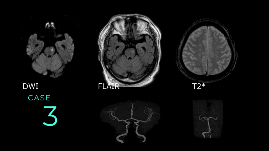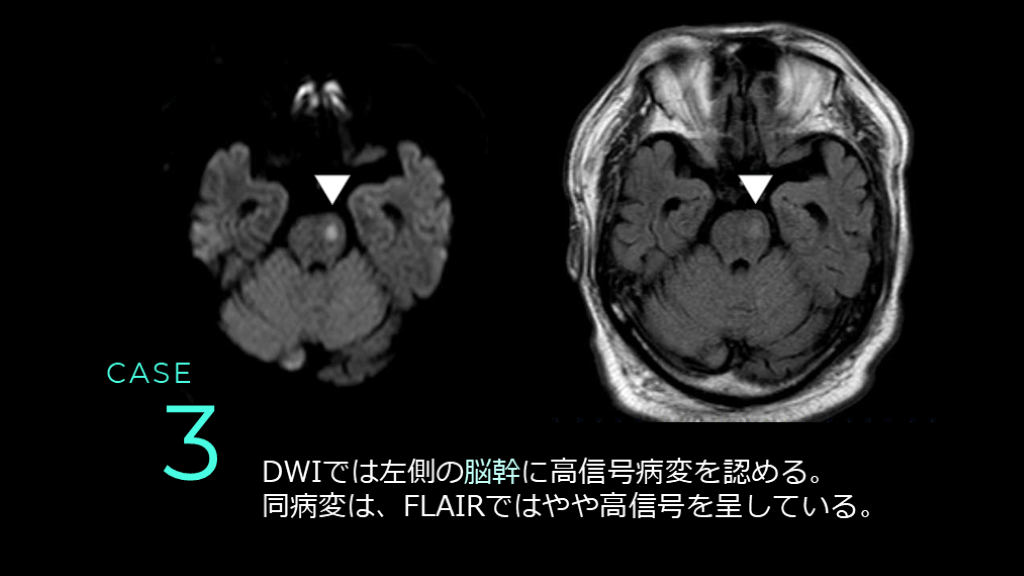 #49. CASE 3 DWIでは左側の脳幹に高信号病変を認める。