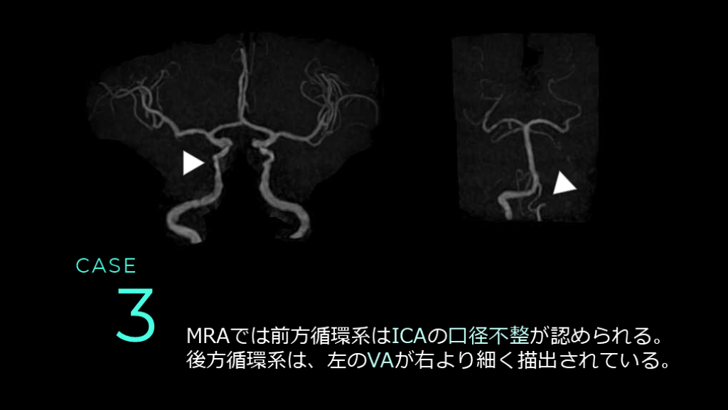 #50. CASE 3 MRAでは前方循環系はICAの口径不整が認められる。