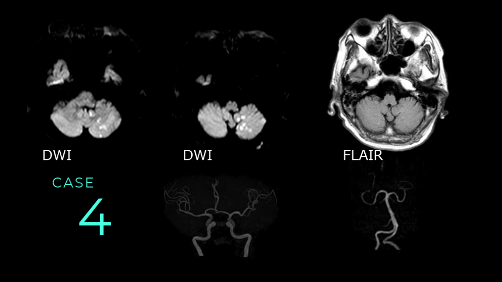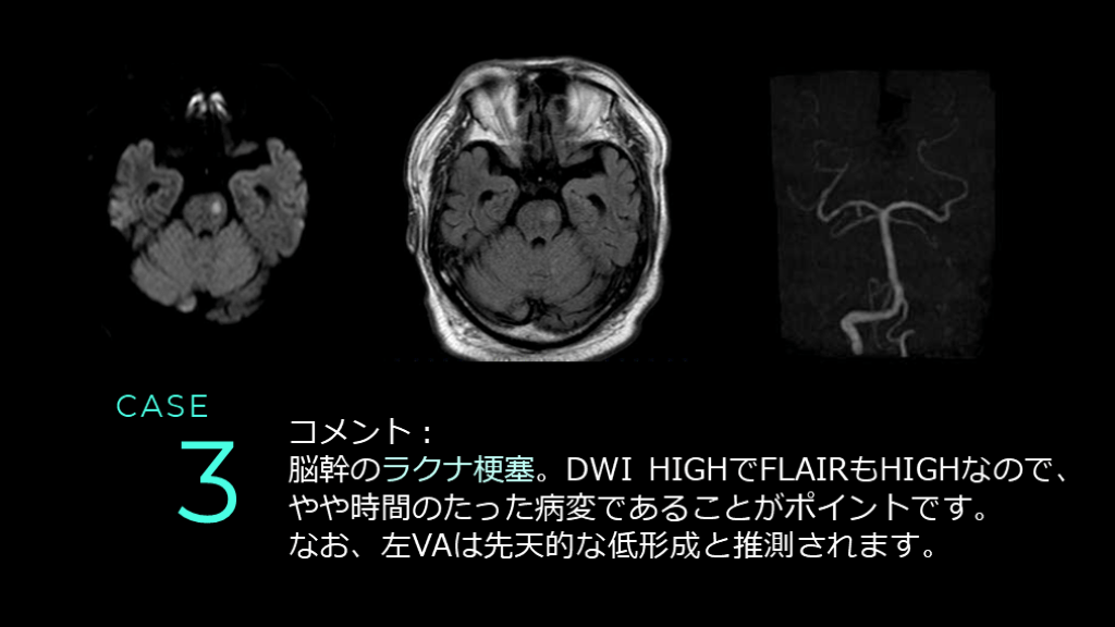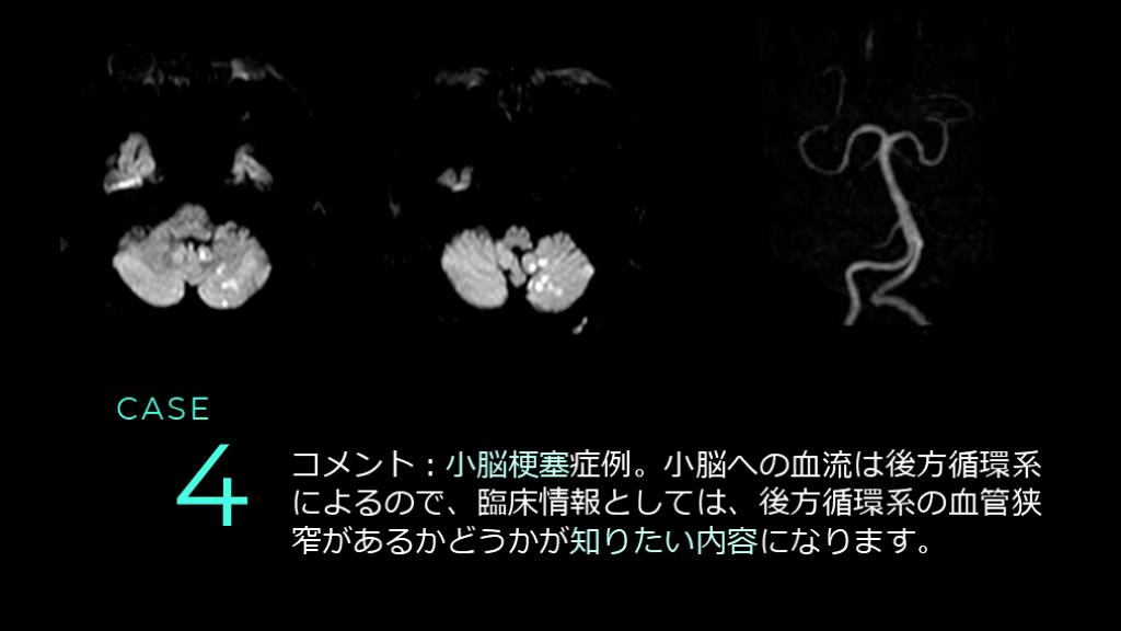 #55. CASE 4 コメント:小脳梗塞症例。小脳への血流は後方循環系によるので、臨床情報としては、後方循環系の血管狭窄があるかどうかが知りたい内容になります。