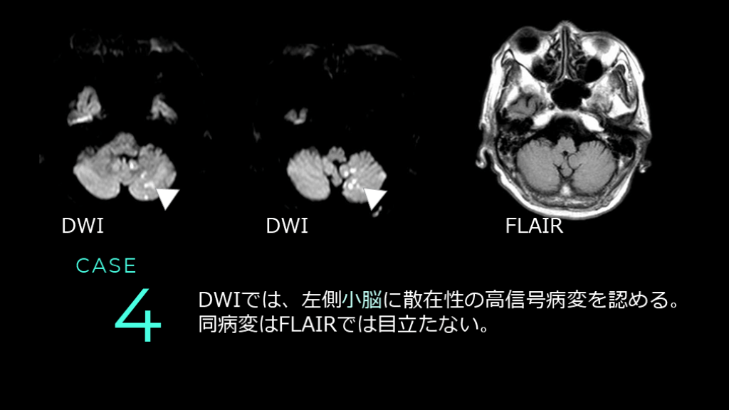 #53. CASE 4 DWIでは、左側小脳に散在性の高信号病変を認める。