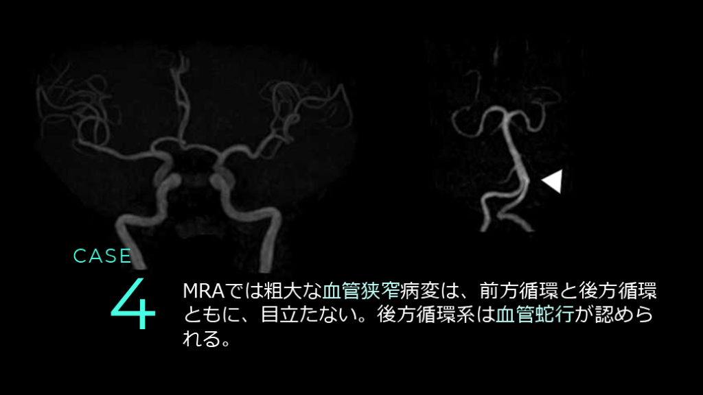 #54. CASE 4 MRAでは粗大な血管狭窄病変は、前方循環と後方循環ともに、目立たない。後方循環系は血管蛇行が認められる。