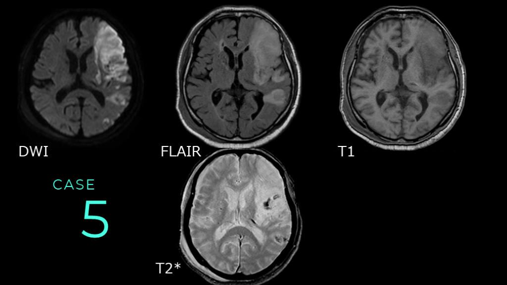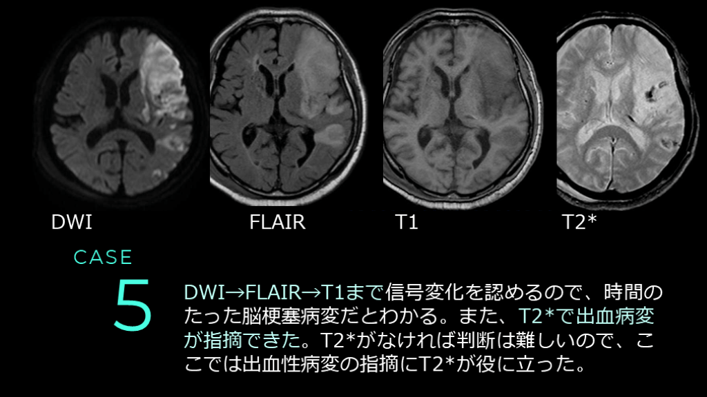#59. CASE 5 DWI→FLAIR→T1まで信号変化を認めるので、時間のたった脳梗塞病変だとわかる。また、T2*で出血病変が指摘できた。T2*がなければ判断は難しいので、ここでは出血性病変の指摘にT2*が役に立った。 DWI FLAIR T1 T2*