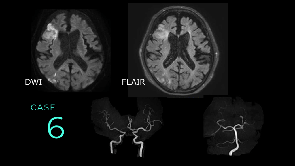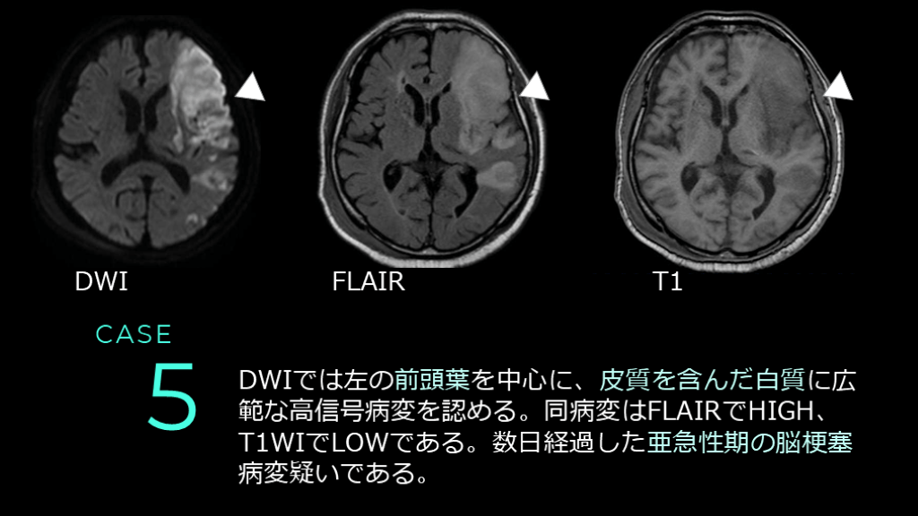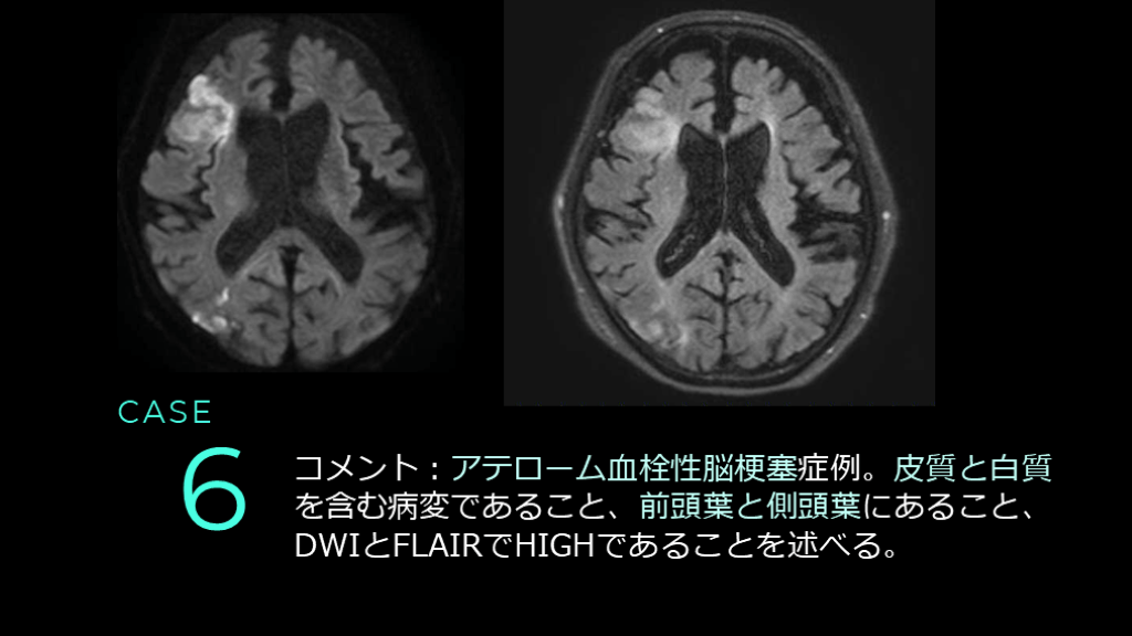 #63. CASE 6 コメント:アテローム血栓性脳梗塞症例。皮質と白質を含む病変であること、前頭葉と側頭葉にあること、DWIとFLAIRでHIGHであることを述べる。