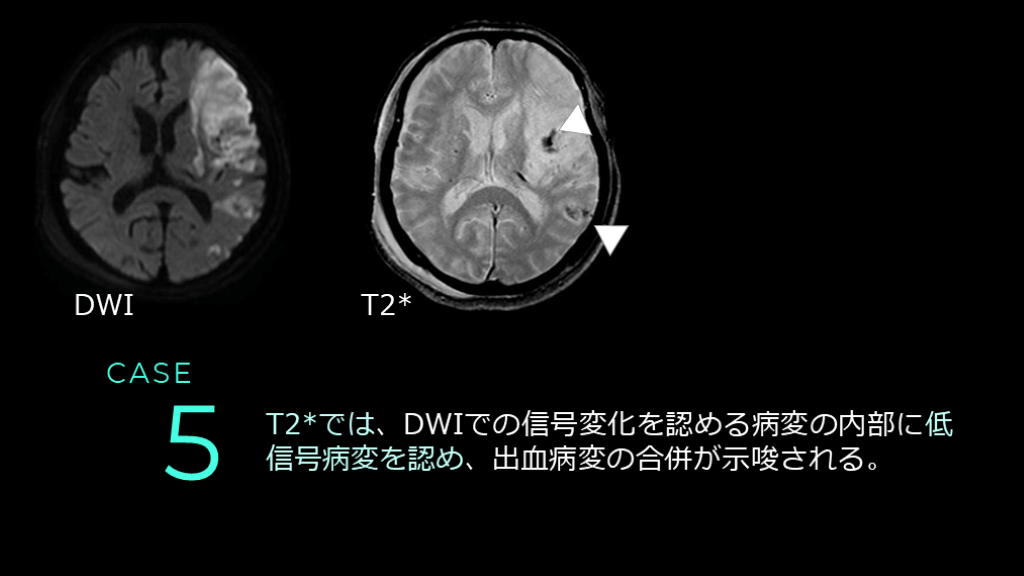 #58. CASE 5 T2*では、DWIでの信号変化を認める病変の内部に低信号病変を認め、出血病変の合併が示唆される。 DWI T2*