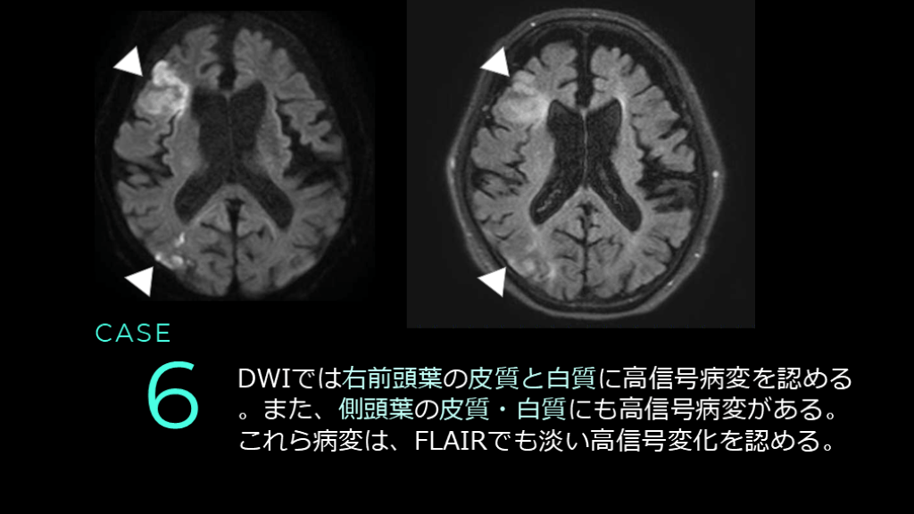 #61. CASE 6 DWIでは右前頭葉の皮質と白質に高信号病変を認める。また、側頭葉の皮質・白質にも高信号病変がある。これら病変は、FLAIRでも淡い高信号変化を認める。
