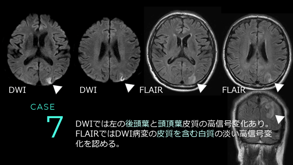 #65. CASE 7 DWIでは左の後頭葉と頭頂葉皮質の高信号変化あり。