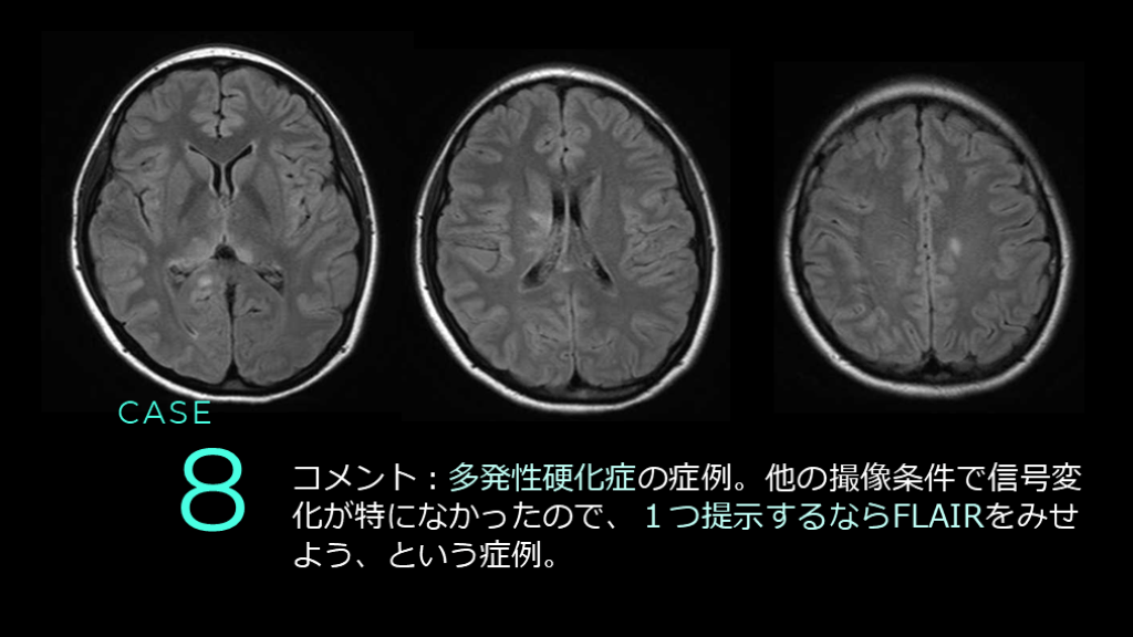#69. 8 CASE コメント:多発性硬化症の症例。他の撮像条件で信号変化が特になかったので、1つ提示するならFLAIRをみせよう、という症例。