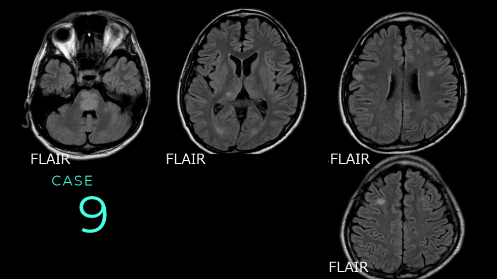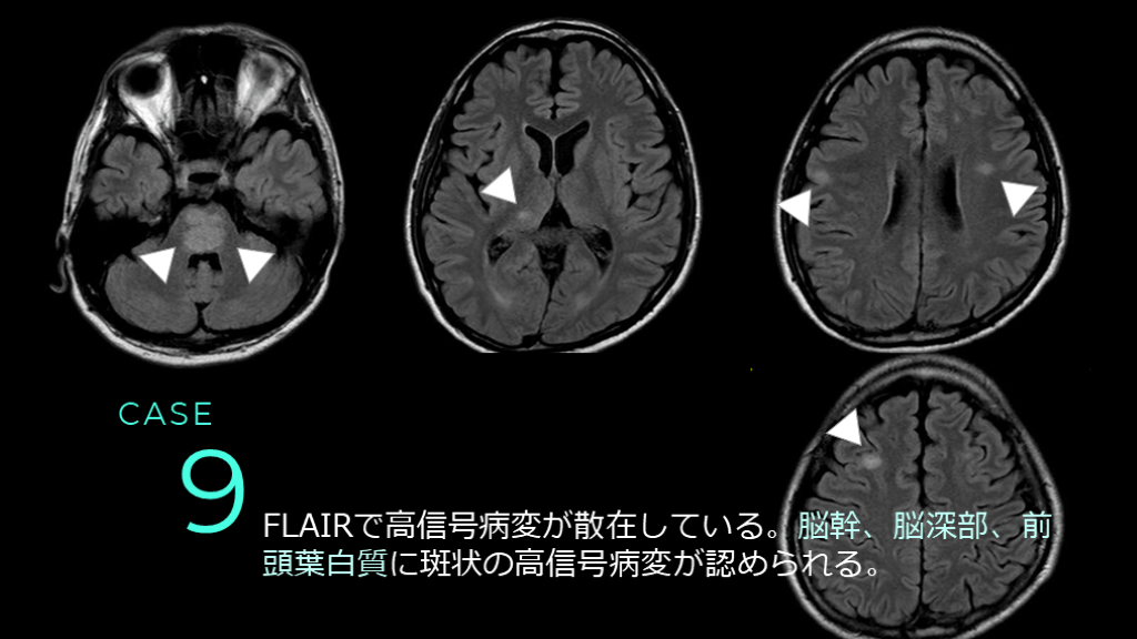 #71. 9 CASE FLAIRで高信号病変が散在している。脳幹、脳深部、前頭葉白質に斑状の高信号病変が認められる。