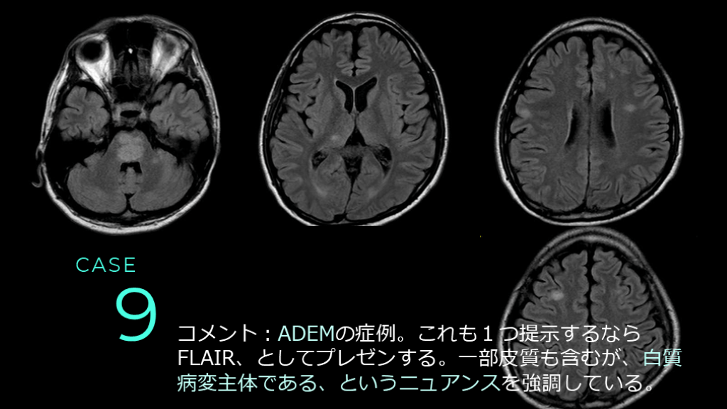#72. 9 CASE コメント:ADEMの症例。これも1つ提示するならFLAIR、としてプレゼンする。一部皮質も含むが、白質病変主体である、というニュアンスを強調している。